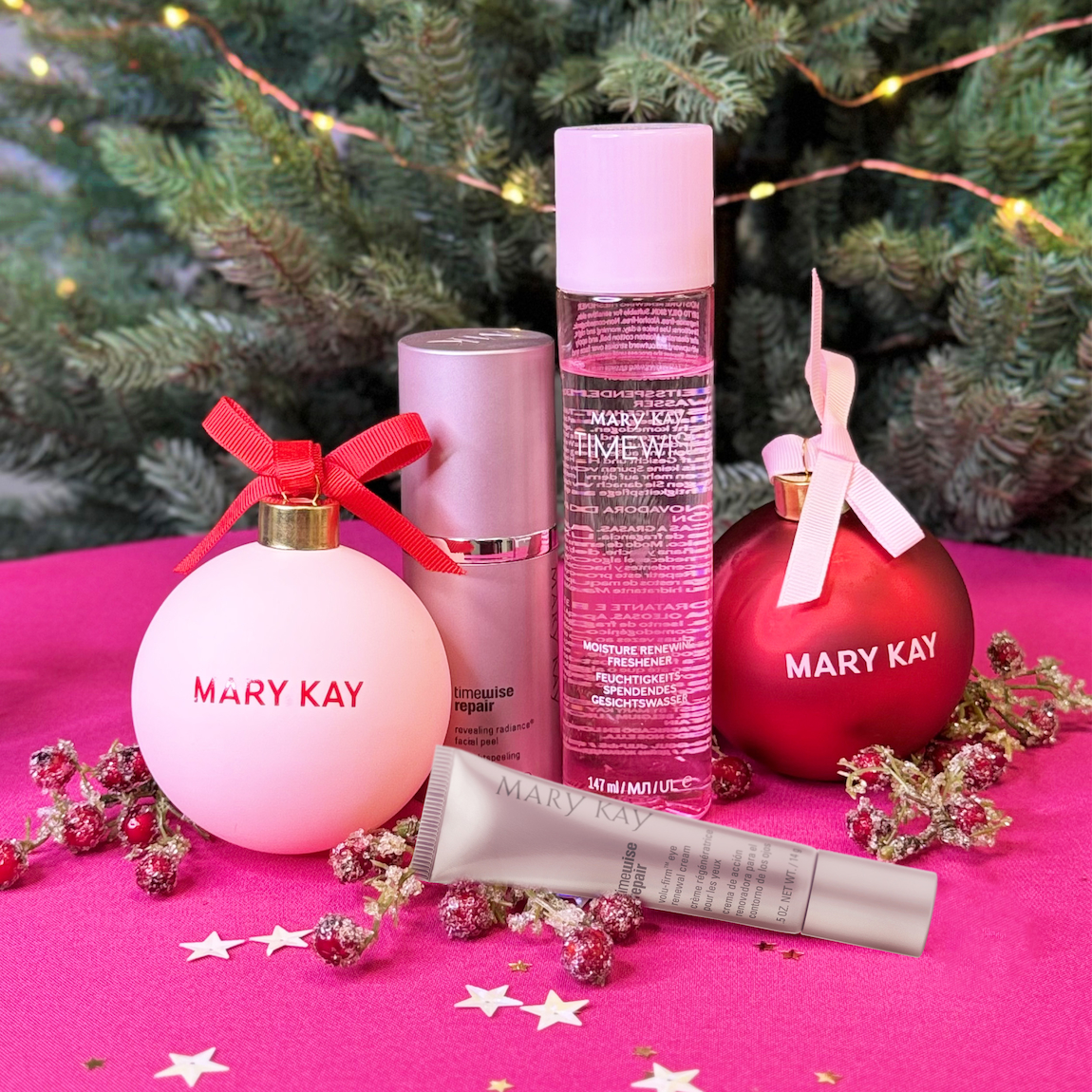 Зволожувальний та оновлювальний тонік TimeWise® Пілінг для обличчя TimeWise Repair® Revealing Radiance® Оновлювальний крем для шкіри навколо очей TimeWise Repair® Volu-Firm® Набір ялинкових іграшок, 2 шт